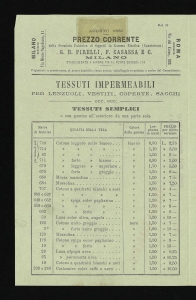 Listino prezzi di tessuti impermeabili della G.B. Pirelli, F. Casassa & C. relativo all'agosto 1880 |