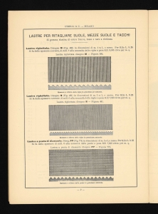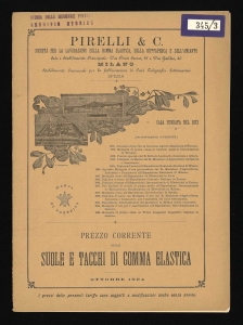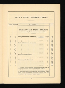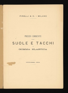 Listino prezzi di suole e tacchi in gomma elastica della Pirelli & C. (all'ottobre 1894). Il listino è stato stampato a Milano nell'ottobre 1894 dalla Tipografia Pizzi di via Visconti, 14. |
