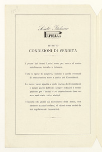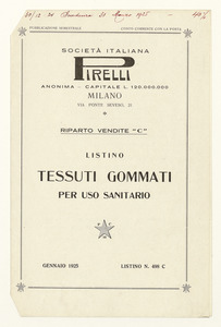 Listino prezzi di tessuti gommati per uso sanitario, n. 498 C della Società Italiana Pirelli - Reparto vendite "C" (al gennaio 1925). Il listino è stato stampato a Milano dalla Tipografia Pirelli. |