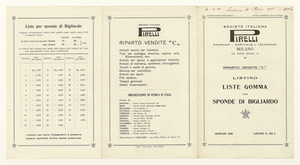 Listino prezzi di liste in gomma per sponde da biliardo, n. 503 C della Società Italiana Pirelli - Reparto vendite "C" (al gennaio 1925). Il listino è stato stampato a Milano dalla Tipografia Pirelli. |
