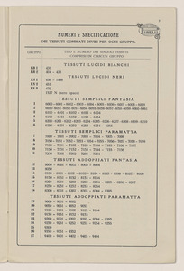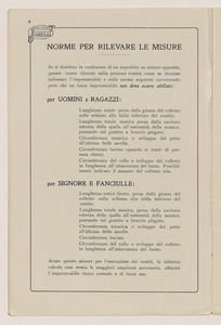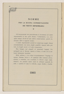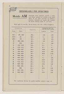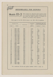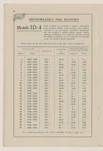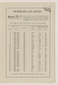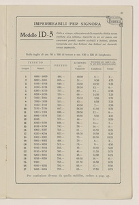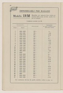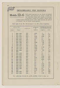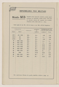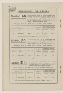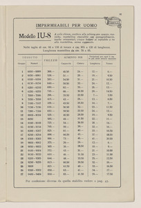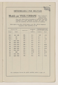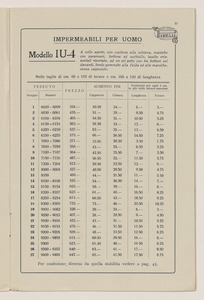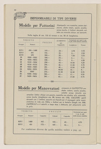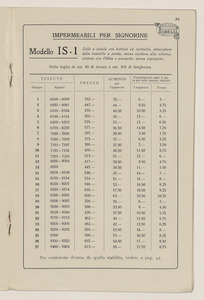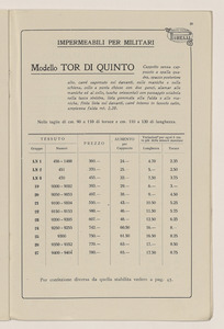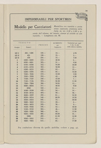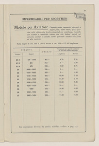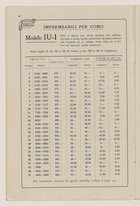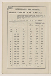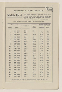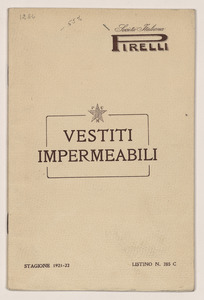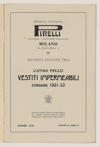 Listino prezzi di vestiti impermeabili, n. 285 C della Società Italiana Pirelli (stagione 1921 - 1922). Il listino è stato stampato a Milano dalla G. Garbagnati. |