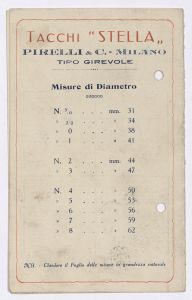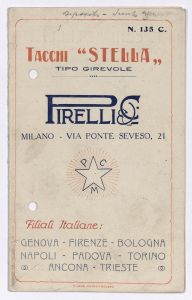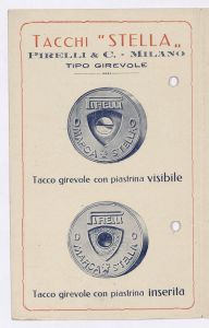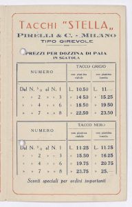 Pieghevole con listino prezzi dei tacchi "Stella" tipo girevole della Pirelli & C. Il listino è stato stampato a Milano presso le Officine Pilade Rocco. |