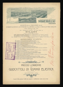 Listino prezzi di giocattoli in gomma elastica della Pirelli & C. (al novembre 1903). Il listino è stato stampato a Milano il 1° febbraio 1904 dalla Tipografia Pizzi di via Visconti, 14. |