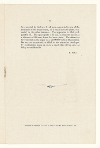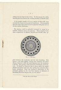 Copia della pubblicazione "High - tension experiments made in Messrs. Pirelli & Co.'s Pavilion, at the Milan Exhibition", a cura dell'ingegner Emanuele Jona. La pubblicazione รจ stata stampata a Londra da George Tucker, Salisbury court, Fleet street, E. C. |