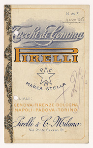 Pieghevole con listino prezzi dei tacchi in gomma "Marca Stella", n. 85 E della Pirelli & C. (al marzo 1915). Il listino è stato stampato a Milano nel marzo 1915 da Pilade Rocco - Impressioni d'arte. |