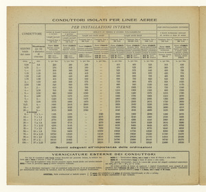 Listino speciale dei tipi più correnti di fili, corde e cavetti isolati per installazioni elettriche, n. 391 A della Società Italiana Pirelli (al marzo 1923). Il listino è stato stampato a Milano nel marzo 1923 dalla Tipografia Pirelli. |