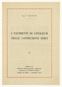 Copia della pubblicazione "I pavimenti di linoleum nelle costruzioni edili" dell'ingegner V. Magnani, estratta dal Bollettino dell'Associazione nazionale ingegneri ed architetti italiani - Collegio di Udine, nel settembre 1924. La pubblicazione è stata stampata a Milano dall'Officina grafica "La Bodoniana" di via Broggi, 13. |