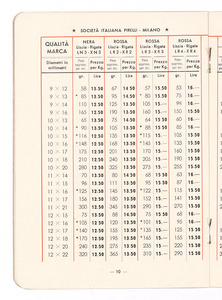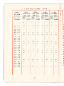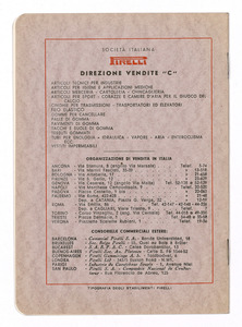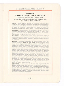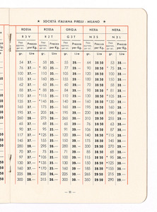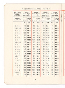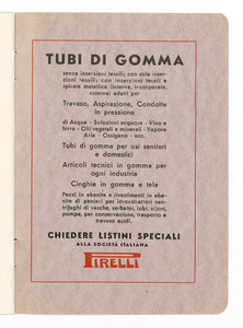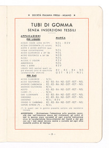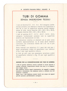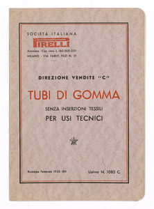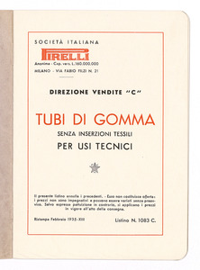 Listino prezzi di tubi in gomma senza inserzioni tessili per usi tecnici, n. 1083 C della Società Italiana Pirelli - Direzione vendite "C" (al febbario 1935). Il listino è stato stampato a Milano dalla Tipografia Pirelli. |