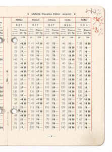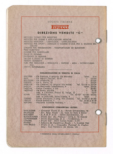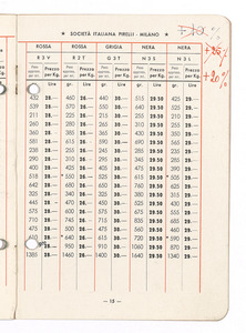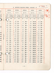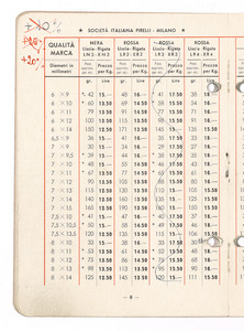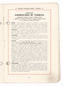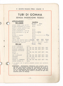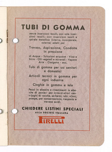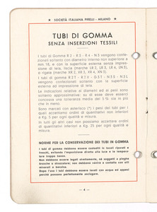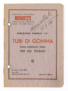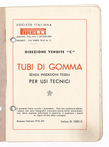 Listino prezzi di tubi in gomma senza inserzioni tessili per usi tecnici, n. 1083 C della Società Italiana Pirelli - Direzione vendite "C" (al febbraio 1935). Il listino è stato stampato a Milano dalla Tipografia Pirelli. |
