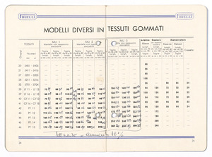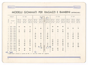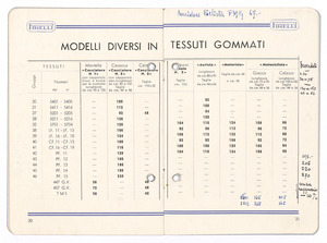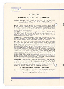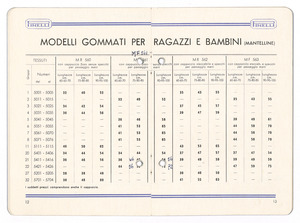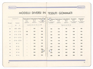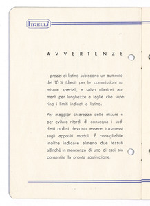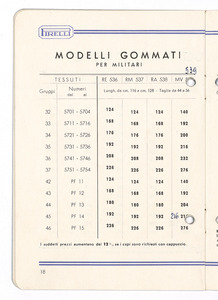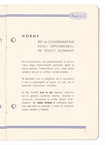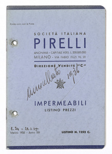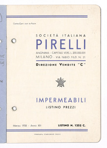 Listino prezzi per impermeabili, n. 1252 C della Società Italiana Pirelli - Direzione vendite "C" (al marzo 1935). Il listino è stato stampato a Milano dalla Tipografia Pirelli. |