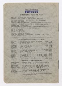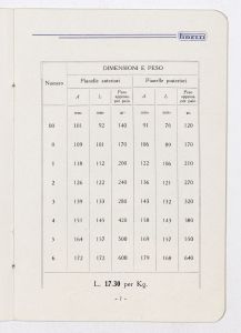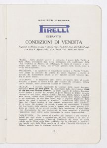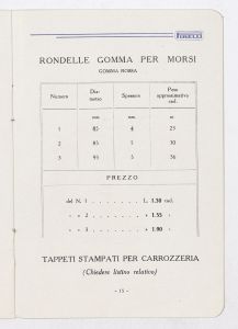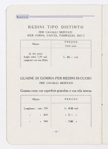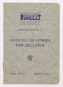 Listino prezzi di articoli in gomma per selleria, n. 1378 C della Società Italiana Pirelli - Direzione vendite "C" (all'aprile 1938). Il listino è stato stampato a Milano dalla Tipografia Pirelli. |