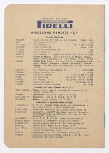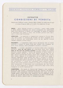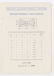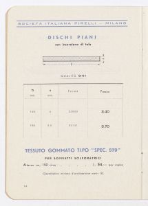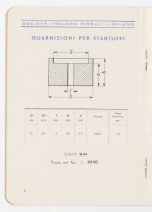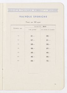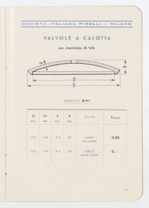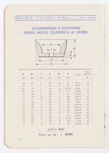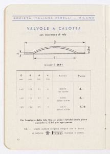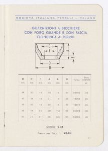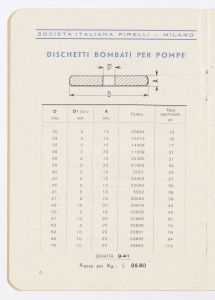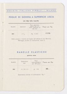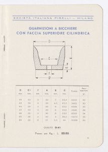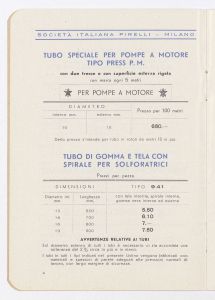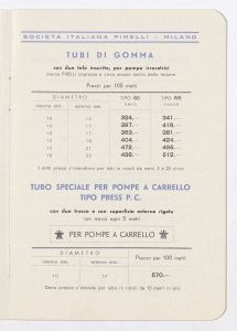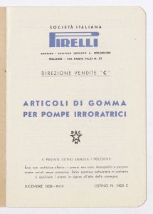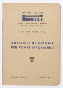 Listino prezzi di articoli in gomma per pompe irroratrici, n. 1423 C della Società Italiana Pirelli - Direzione vendite "C" (al dicembre 1939). Il listino è stato stampato a Milano nel gennaio 1940 dalla Tipografia Enrico Gualdoni. |