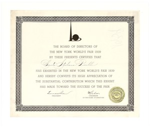Certificato rilasciato alla Società Italiana Pirelli per la partecipazione alla Fiera Mondiale di New York ("The New York World's Fair") del 1939 |