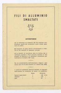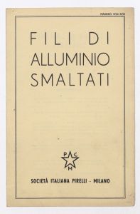 Listino prezzi di fili di alluminio smaltati della Società Italiana Pirelli (al maggio 1940). Il listino è stato stampato a Milano dall'Officina d'Arte Grafica A. Lucini & C. |