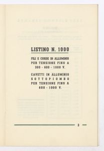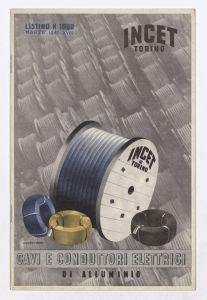 Listino prezzi di cavi e conduttori elettrici in alluminio, n. 1000 della Industria Nazionale Cavi Elettrici (I.N.C.E.T.) di Torino (al marzo 1940). Il listino è stato stampato a Borgo S. Dalmazzo dall'Istituto Grafico Bertello/Edizione Aerostudio Borghi. |