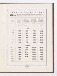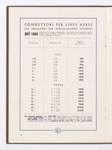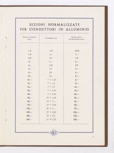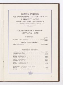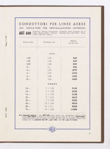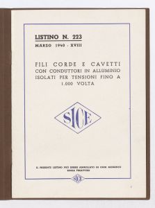 Listino prezzi di fili, corde e cavetti con conduttori in alluminio isolati per tensioni fino a 1000 volt, n. 223 della Società Italiana Conduttori Elettrici Isolati e Prodotti Affini (S.I.C.E.) di Livorno (al marzo 1940). Il listino è stato stampato a Livorno dalla Officine Grafiche G. Chiappini. |