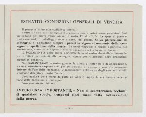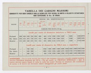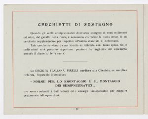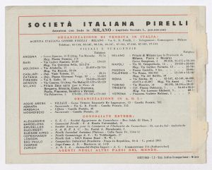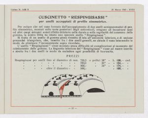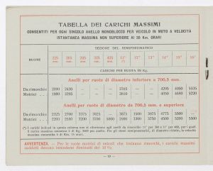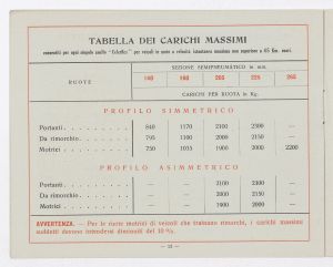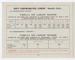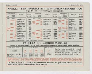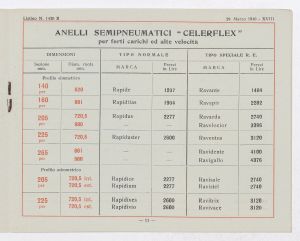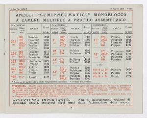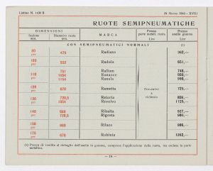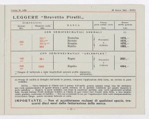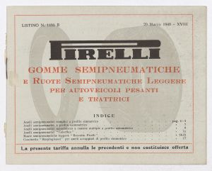 Listino prezzi di gomme e ruote semipneumatiche leggere per autoveicoli pesanti e trattrici, n. 1430 B dell'Agenzia Italiana Gomme Pirelli (al 29 marzo 1940). Il listino è stato stampato a Milano dallo Stabilimento Grafico Giuseppe Casati. |
