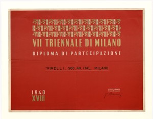 Diploma rilasciato alla Società Italiana Pirelli per la partecipazione alla VII Triennale di Milano del 1940. Il diploma è stato stampato a Milano dalle Industrie Grafiche Pietro Vera. |