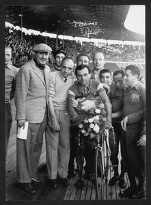 | Descrizione specifica del soggetto | Il vincitore Alfo Ferrari con un altro corridore, Luigi Spotti, e altre persone al Velodromo Vigorelli |