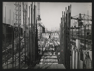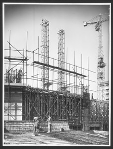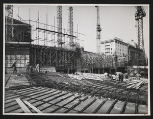 | Descrizione specifica del soggetto | Una fase della costruzione della Nuova Sede: preparazione del banchinaggio della soletta del pavimento del 5° piano. In primo piano, i ferri verticali che costituiscono l'armatura di uno dei pilastri dell'edificio. L'immagine è stata pubblicata da "Fatti e Notizie" (anno VIII, n. 4-5, aprile-maggio 1957, p. 11) |