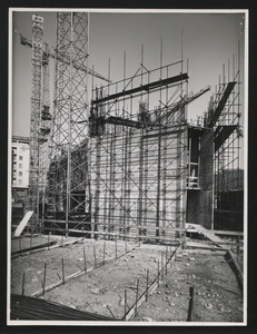 | Descrizione specifica del soggetto | Una fase della costruzione della Nuova Sede: l'edificio ha raggiunto il 5° piano. Visione d'insieme dell'attrezzatura in elevazione del cantiere: due gru di 54 metri di altezza, una gru di altezza inferiore, due elevatori per il trasporto del calcestruzzo ai piani. L'immagine è stata pubblicata da "Fatti e Notizie" (anno VIII, n. 4-5, aprile-maggio 1957, p. 11) |