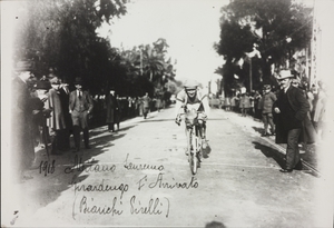 | Full description of the subject | The 11th Milano-Sanremo, on 14 April 1918: the event was won by Costante Girardengo, who raced with the Bianchi-Pirelli team, followed by Gaetano Belloni and Ugo Agostoni with Bianchi-Pirelli. The photo shows Costante Girardengo at the finish: the picture was published in the "Pirelli" magazine (Year II, no. 4, July-August 1949, p. 60) |