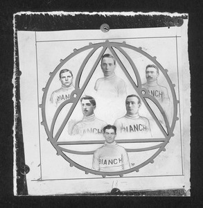 | Descrizione specifica del soggetto | Composizione di ritratti dei corridori ciclisti della squadra Bianchi: il disegno è composto da una forma circolare, all'interno della quale è inscritto un triangolo |