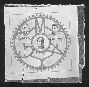 | Descrizione specifica del soggetto | Composizione di ritratti di corridori ciclisti: il disegno in cui sono inserite le effigi rappresenta l'ingranaggio di una bicicletta ed è composto dalla catena di trasmissione e da due corone dentate di dimensioni diverse, nella più grande delle quali è ripetuta tre volte la lettera "A" |