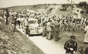 | Descrizione specifica del soggetto | Veduta dall'alto di una strada, nella quale si trovano alcuni uomini, probabilmente organizzatori della corsa o membri delle squadre ciclistiche |