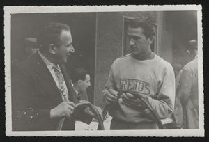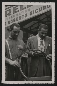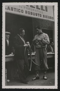 | Descrizione specifica del soggetto | Il corridore Marcello Ciolli insieme al Rag. Bernasconi alla distribuzione dei tubolari |