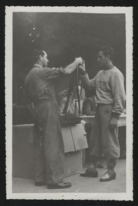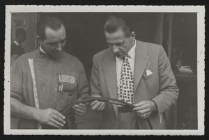 | Descrizione specifica del soggetto | Distribuzione dei tubolari presso "La Gazzetta dello Sport": Alfredo Binda, insieme a un tecnico, osserva i tubolari |