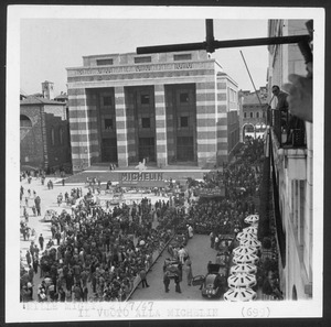 | Descrizione generale del soggetto | XIV edizione della Mille Miglia disputatasi tra il 21 e il 22 giugno 1947: vedute di Piazza della Vittoria a Brescia e di striscioni pubblicitari Pirelli collocati all'arrivo. La manifestazione vide la vittoria di Clemente Biondetti ed Emilio Romano su Alfa Romeo, seguiti da Tazio Nuvolari con Francesco Carena e da Inico Bernabei con Tullio Pacini su Cisitalia. |