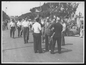 | Full description of the subject | Race officials, staff and drivers in front of the pits |