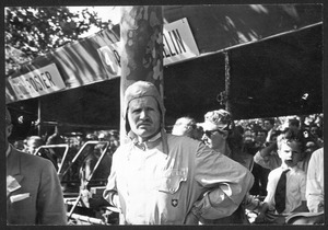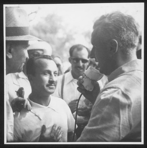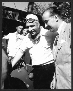 | Descrizione specifica del soggetto | Il pilota Gigi Villoresi parla alla radio prima della partenza: di fronte a lui il corridore argentino Pascual Puopolo |
