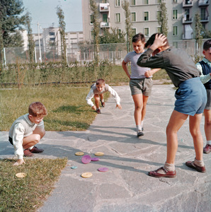 | Descrizione specifica del soggetto | Bambini che giocano alle "piastre" in un parco giochi, probabilmente quello del Villaggio Pirelli di Cinisello Balsamo |