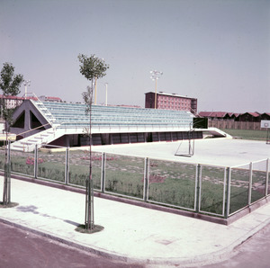 | Descrizione generale del soggetto | Il rinnovamento -nel 1955- dei vecchi impianti sportivi di Viale Sarca, risalenti agli anni Venti del Novecento, prevede anche la costruzione di una nuova tribuna. Un moderno fabbricato a due fronti: uno si affaccia sulla pista da hokey, l'altro sul campo da basket |