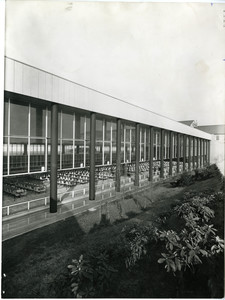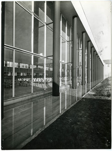 | Descrizione specifica del soggetto | L'esterno della mensa, con la vetrata alta 9,5 metri, scandita da sottili colonne scure, che emergono da una striscia d'acqua,da cui si alza un terrapieno realizzato a prato. La fotografia è pubblicata sulla copertina di "Fatti e Notizie" n. 1, 1957 |