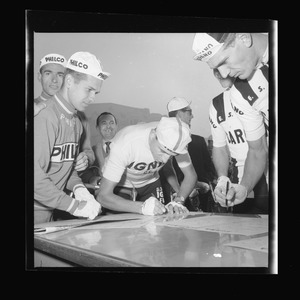 | General description of the subject | The 55th Giro di Lombardia on 21 October 1961 with the start at the Pirelli Centre in Milan: the event was won by Vito Taccone, who raced with the Atala-Pirelli team, followed by Imerio Massignan and Renzo Fontona with Legnano. The photos show the preparations for the race at the Pirelli Centre and the start of the race. |