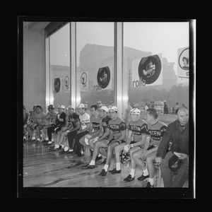 | Full description of the subject | Cyclists of the Carpano and Faema teams in the courtyard of the Pirelli Centre |
