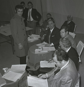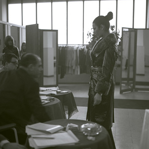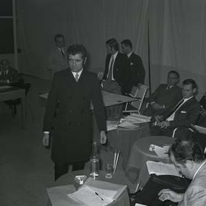 | Descrizione generale del soggetto | Presentazione di soprabiti, impermeabili e abiti della collezione autunno-inverno, da uomo e da donna, al cospetto di persone intente a prendere annotazioni sui capi presentati. Si notano alle pareti alcuni manifesti pubblicitari della Pirelli Confezioni |