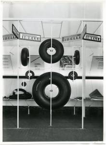 | Descrizione generale del soggetto | Stand della Pirelli allestito per la Mostra dell'Aeronautica di Milano del 1952. Esposizione di pneumatici avio, gommoni, salvagenti e serbatoi. |