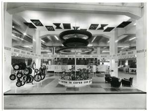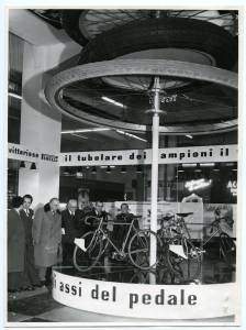 | Descrizione generale del soggetto | Vedute dello stand Pirelli progettato da Piero Ottinetti per la XXXII Esposizione del Ciclo e Motociclo del 1954, con l'esposizione di pneumatici per cicli e motocicli e di accessori per moto, motor-scooter e biciclette, imbottiture per sedute. Pannelli fotografici documentano la carriera sportiva di campioni del ciclismo. Esposizione della bicicletta di Fausto Coppi, vincitore del Giro d'Italia e del Giro di Francia nel 1952. Riproduzione del bozzetto per il progetto del posteggio Pirelli. |