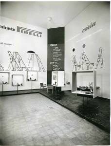 | Descrizione specifica del soggetto | Veduta parziale dello stand Pirelli. Esposizione di calzature e suole. Nelle teche cartelli vetrina "Camminate Pirelli" di Bruno Munari. |