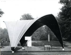| Descrizione specifica del soggetto | Veduta frontale della struttura a volta a crociera ed archi parabolici a pianta esagonale nel giardino antistante il Palazzo della Triennale di Milano |