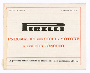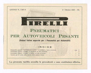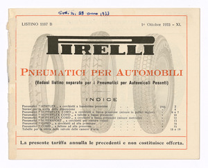 Questa sezione è dedicata alla navigazione di una serie di categorie tematiche presenti trasversalmente in tutti i documenti attualmente pubblicati nell'archivio storico on line. Le categorie sono relative ai tanti prodotti realizzati da Pirelli nel corso della sua storia, alle manifestazioni fieristiche nelle quali venivano presentati, ai luoghi della produzione e del lavoro (sedi e stabilimenti), ai veicoli che nel tempo hanno montato pneumatici Pirelli (auto, moto, biciclette, autocarri, macchine agricole, aerei), alle manifestazioni sportive con un particolare focus sul mondo delle corse alle quali Pirelli ha partecipato nel corso della sua storia. Le voci, collegate tra loro gerarchicamente in una struttura "ad albero", possono essere esplorate dal generale al particolare, dando come risultato tutte le tipologie documentarie relative alla categoria selezionata.