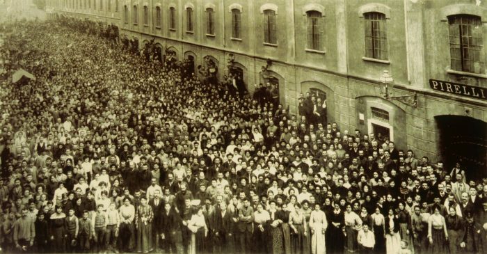 The picture shows thousands of workers coming out of the first Pirelli factory in the Via Ponte Seveso in Milan. The factory was destroyed by bombing in the Second World War and from its ruins rose the Pirelli Tower, the new administrative centre of the Group, in 1960.