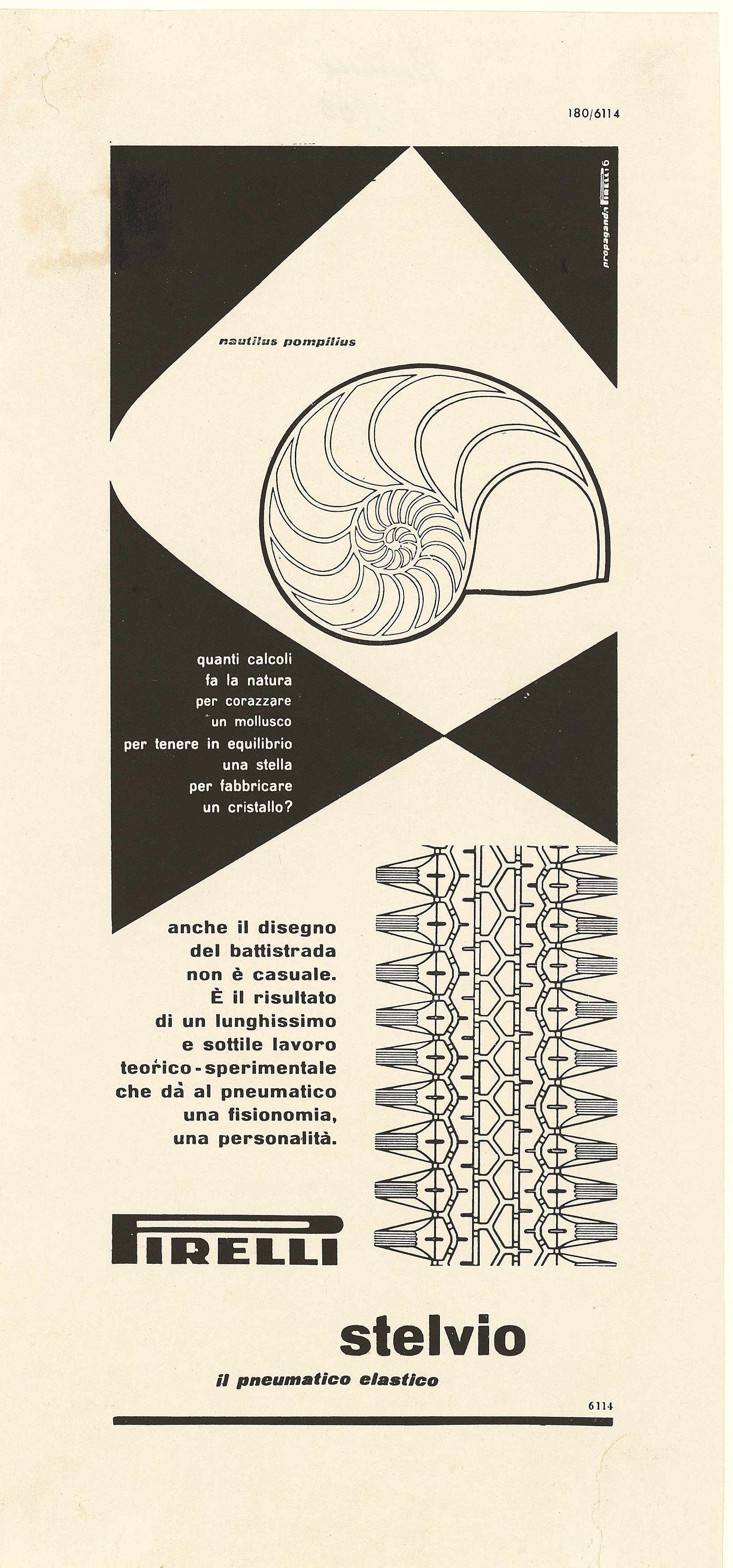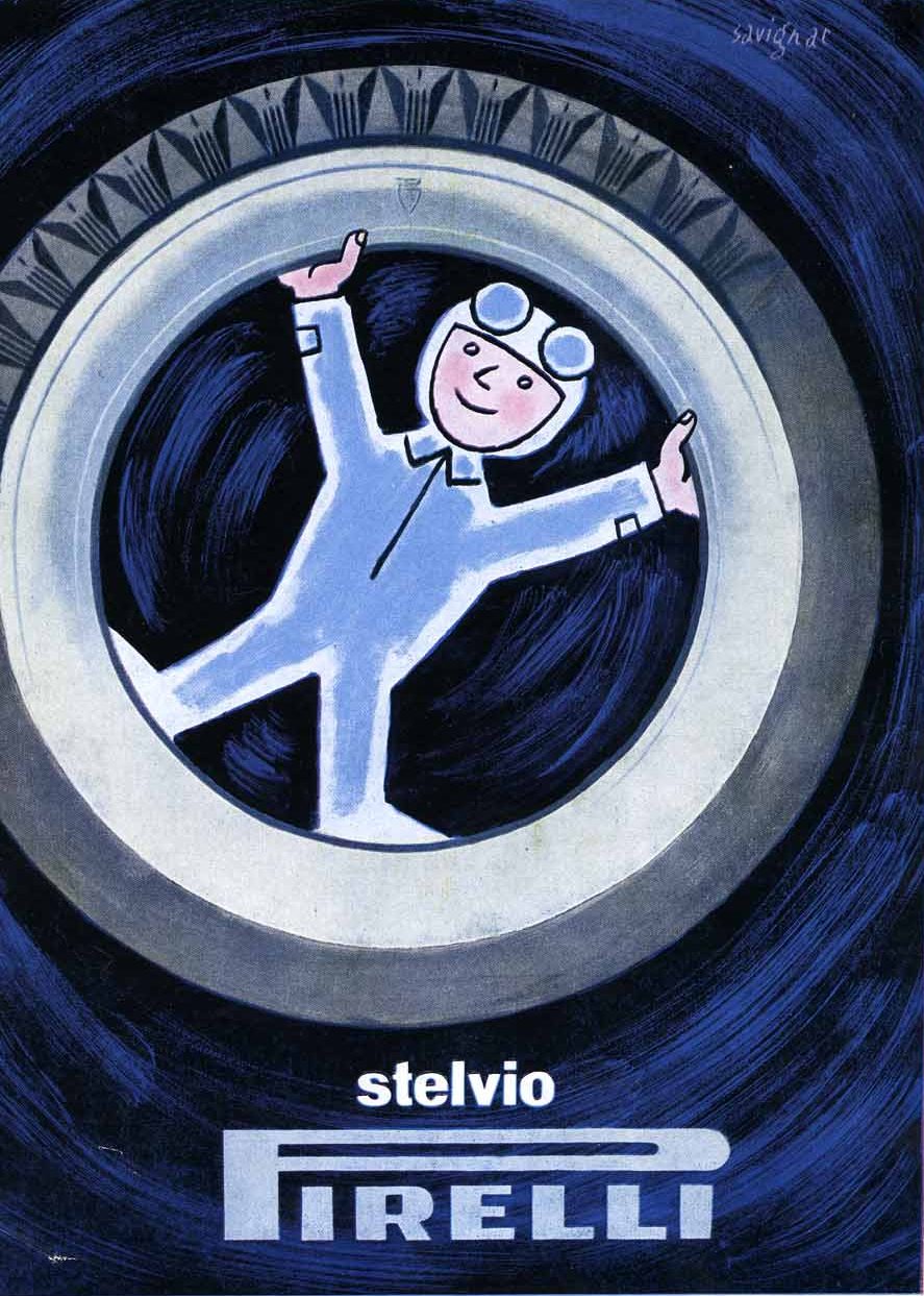 In 1951, Bonini’s Quanti calcoli fa la natura (“How many calculations nature does”) series starts from ideas put forwards by Leonardo Sinisgalli and uses pictures of molluscs, stars and crystals as metaphors for the engineering work (molecules, geometric sequences, genetic sediments) needed to produce a shell, a crustacean or… a Stelvio. The perfect shapes created by nature around us are as amazing as the admiration we feel when we see the way tread patterns are created not by the hand of nature, but by the skills and precision of men and machines. Different visions and forms of creativity enriched Pirelli’s visual communication and helped create the company’s unmistakable style over the decades. In 1952, Pagot Film celebrated the Stelvio in an award-winning animated short in colour entitled Novità al Salone Internazionale dell’Auto di Torino [“News from the Turin Car Show”] directed by Nino and Toni Pagot. In 1956, Franco Grignani created a campaign devoted to travelling. Highly evocative in terms of its landscapes, it offered a new, original take on the technique of collage, highlighting the three key qualities of the Stelvio: flexibility, durability and road holding.
