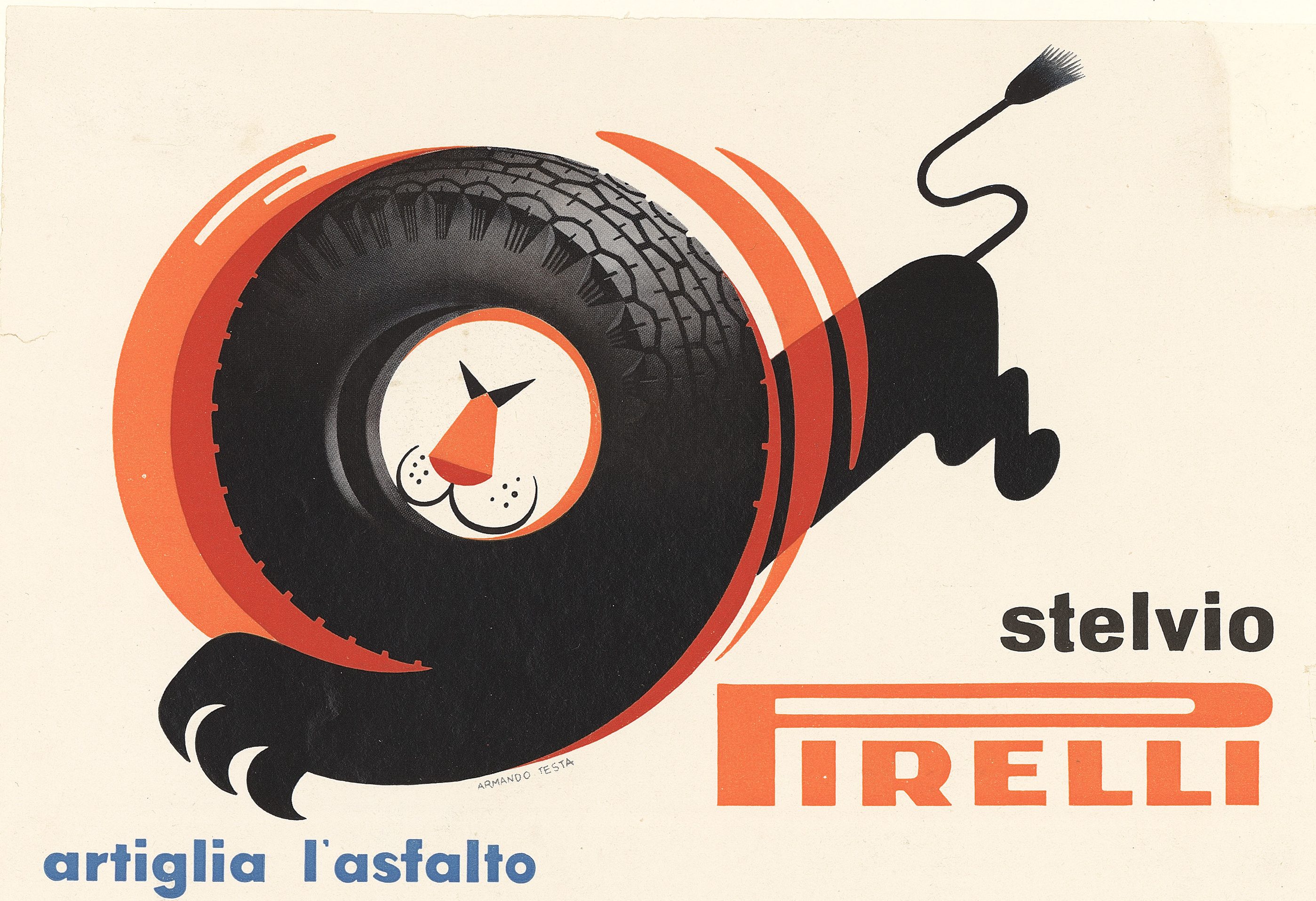 But a more “classic” approach still persisted, as we see in the Sicurezza nella velocità [“Safety at speed!”] campaign by Pavel Engelmann, which followed the evolution of racing tyres from the Stella Bianca to the Stelvio between 1952 and 1954. Here, the dominant colour was the same shade of red that the Futurist Roowy had used forty years previously. Pirelli’s communication also received major awards from a number of international juries – including the Palme d’Or for Advertising, which it won in 1953, and other important honours for its graphic art. What really mattered for the company, however, was the customers’ approval. And this was ensured by Armando Testa and the Artiglia l’asfalto [Claws the Asphalt] poster. The idea of turning the tyre into the mane of a lion, immediately brought to mind the key characteristics of the product: power, grip, and elegance. All in a single minimalist image.