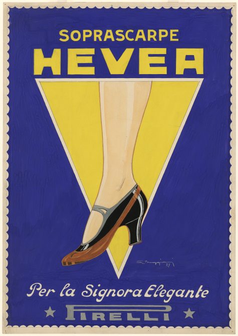 Pirelli named them “Hevea”, a tribute to the waterproofing properties of latex produced by the rubber tree, or Hevea brasiliensis. Raincoats were inspiration for Giorgio Tabet, a Genoese artist who was born in 1904 and graduated from the Accademia di Brera, in a drawing made in 1929 for a range of women’s trench coats, with a display of simplicity, elegance, and a skilful use of colours. And then there are tyres, which in those futuristic years evoked roaring engines, speed, and action. It was this synthesis of modernity that in 1925 prompted the Emilia-born Nino Nanni to create his memorable sketch for the Pirelli Superflex Cord: the amazing tyre that, on the road, could outstrip planes in the sky and speedboats at sea. Renzo Bassi, a Genoese emigrant in Milan, expressed the artistic mood of those years when he created the advertising campaigns for “Stella Bianca” tyres, as Pirelli Cords became known in 1927. The ground-breaking poster designers who brought to bear all their ingenuity for Pirelli products continued to make their mark in the 1930s with new stylistic forms and new graphic ideas. The work made in 1933 by Antonio Salemme, also for the Pirelli Stella Bianca tyre, is emblematic, for here the artist uses a style of lettering that is absolutely innovative in terms of its solid-to-void ratio. We know little about the life of the Genoese Mario Bertoglio, but it is certain that his interpretations of the Stella Bianca tyre, mounted on powerful, elegant cars tackling mountain roads, are some of the clearest images in product communication of that time.