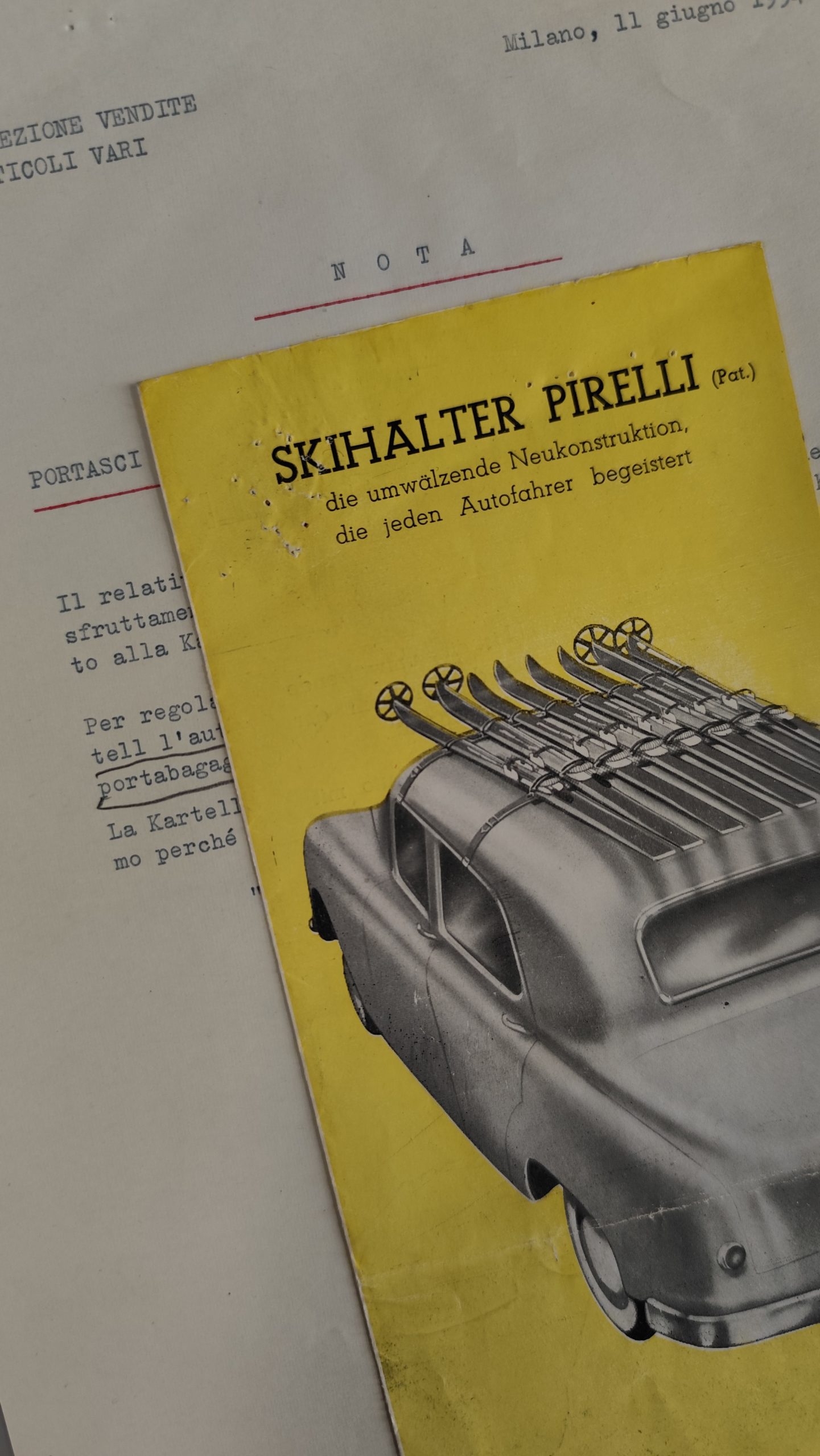 In 1950, two innovations made car journeys to ski resorts easier and more relaxed – a habit that became increasingly common during the decade in Italy and beyond. These were the “Pirelli patented luggage rack” and the “Pirelli patented ski rack”, designed by a Pirelli engineer, Carlo Barassi, and an architect, Roberto Menghi. Pirelli later ceded them to Kartell, which brought them to market.
